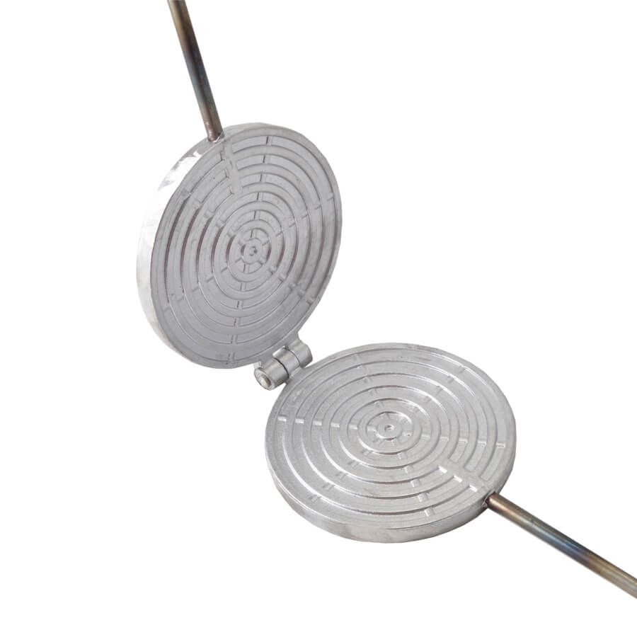 Aparat rotund napolitane, aparat manual pentru napolitane la foc deschis, aparat pentru rondele cu brânză, aparat din aluminiu cu mâner din lemn, napolitane crocante în aer liber, aparat napolitane 13 cm.